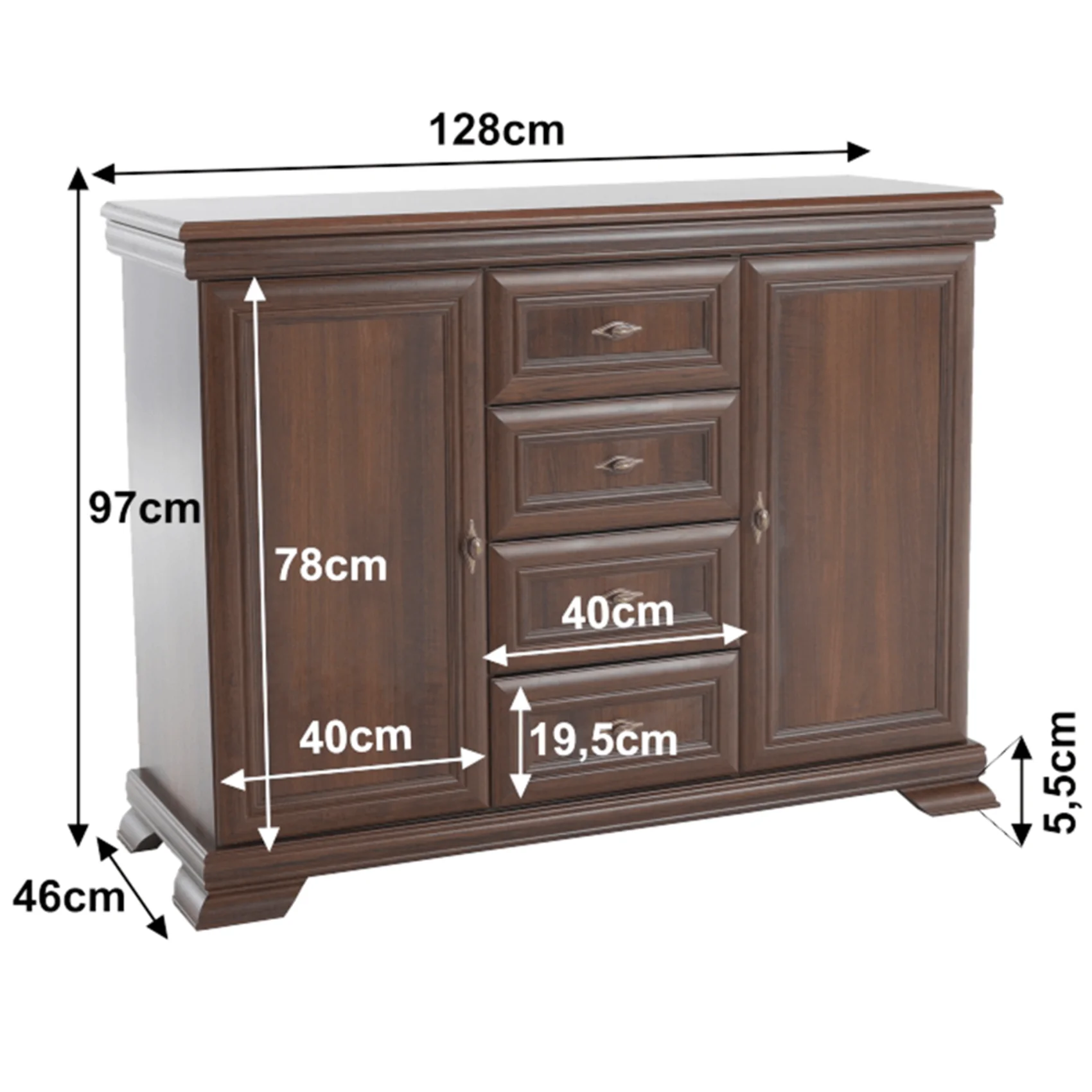 Comoda KORA KK3 este cu două uşi cu patru sertare. Păstrează lucrurile în siguranţă în spatele uşii unde se află un raft. Este fabricată din PAL melaminat de înaltă calitate în finisaj samoa king. Plintele decorative sunt din MDF. Uşile şi sertarele se deschid cu ajutorul mânerelor metalice.