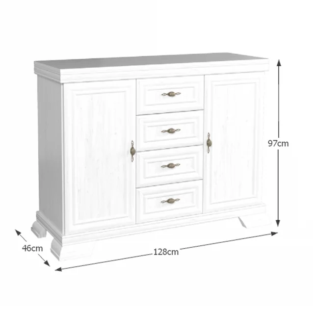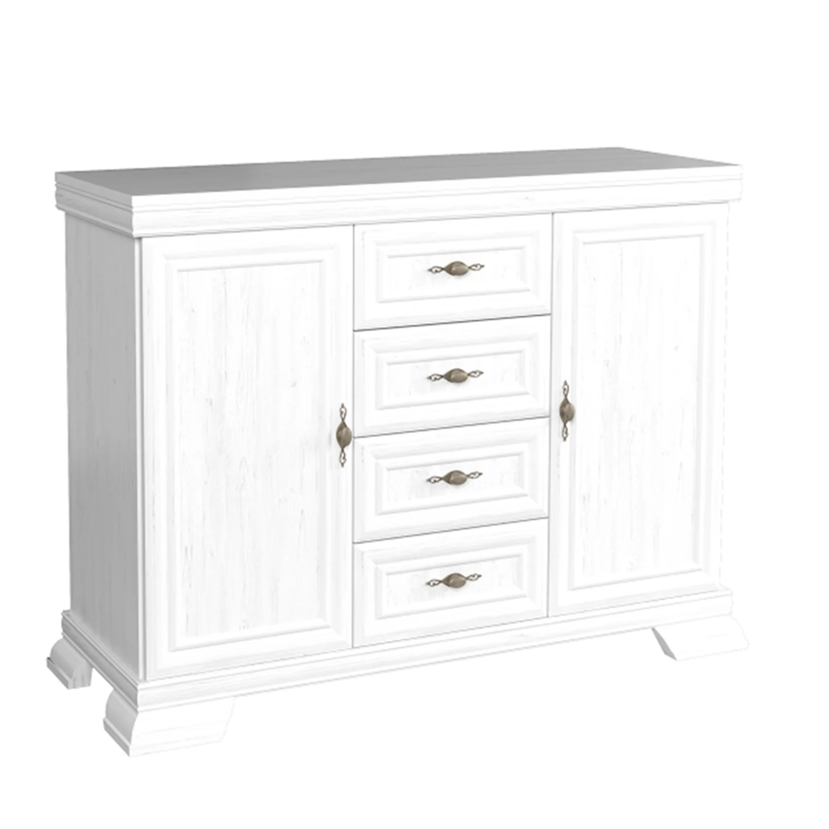 Comoda KK3 KORA este cu două uşi. Spaţiul de depozitare este oferit de două dulapuri şi patru sertare la fel de adânci. Dulapurile sunt cu o poliţă împărţite în două zone de depozitare.