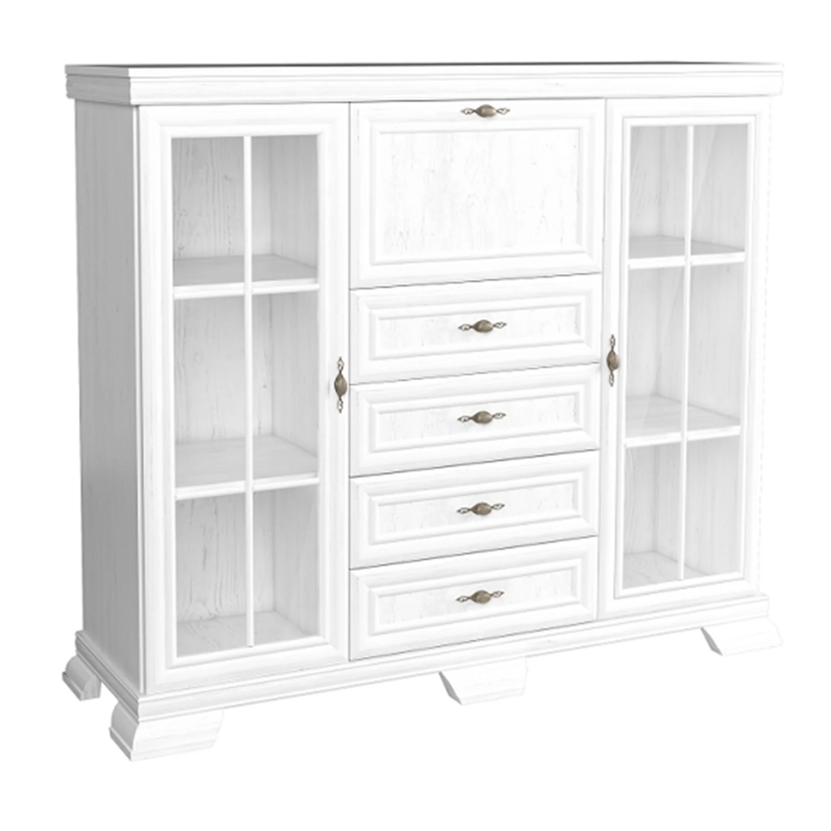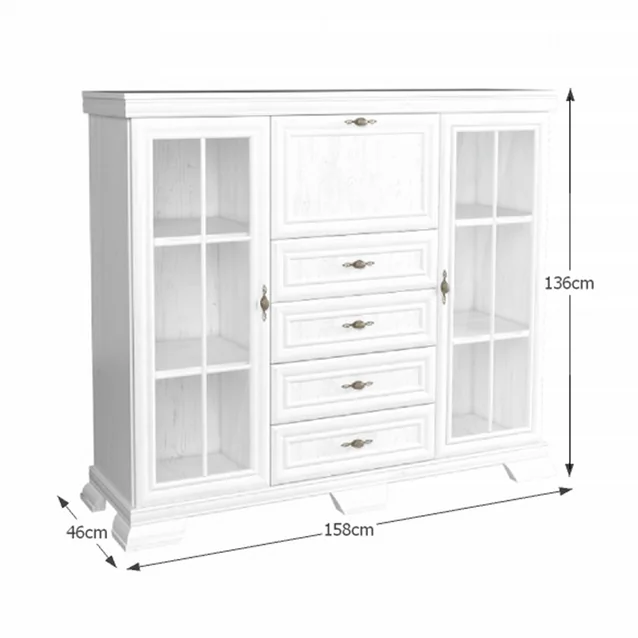 Comoda KORA KK7 este combinată cu dulap de bar. Spaţiul de depozitare este oferit de două dulapuri tip vitrină şi patru sertare la fel de adânci. Dulapurile sunt cu două poliţe împărţite în trei zone de depozitare. Uşile vitrinelor sunt cu sticlă.
