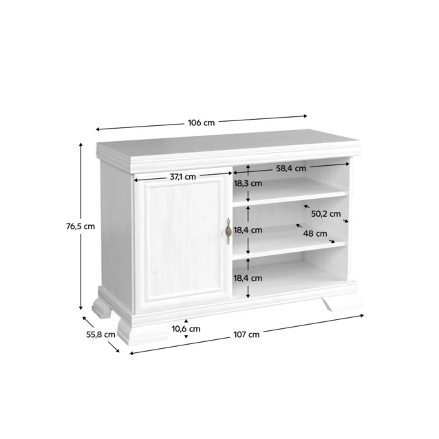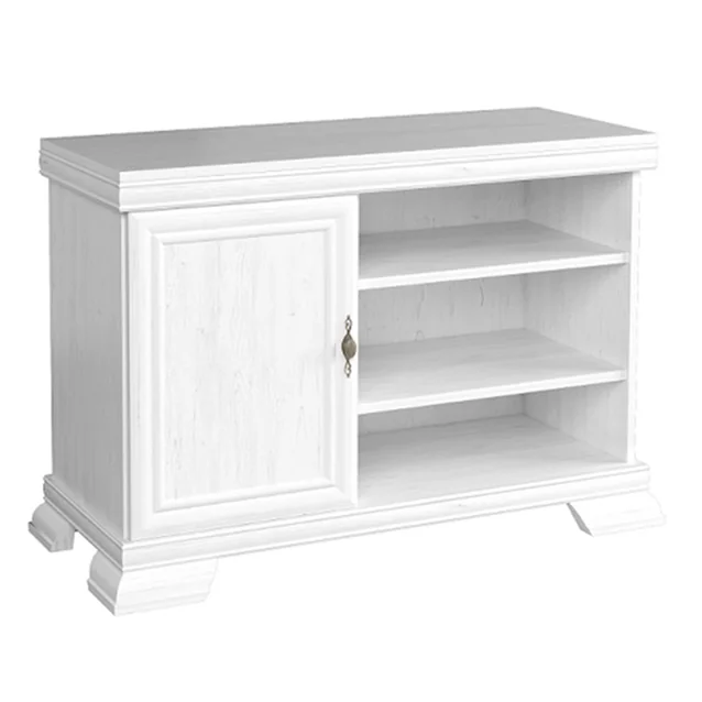 Comoda TV KRT KORA este combinată. Pe partea stângă este un dulap cu uşi, în partea dreaptă este un spaţiu de depozitare deschis cu două poliţe. Dulapul este cu o poliţă împărţit în două suprafeţe de depozitare.
