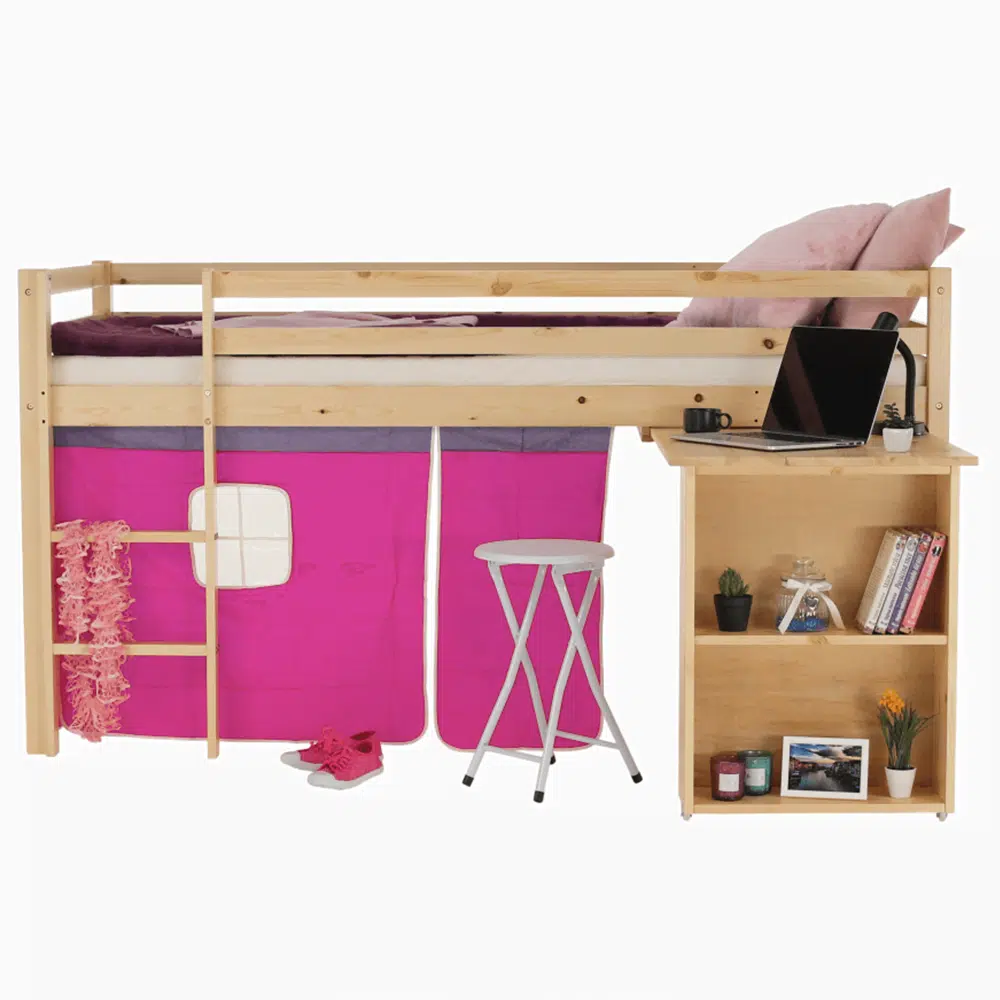 Pat înălţat cu masă PC, lemn de pin/roz, ALZENA