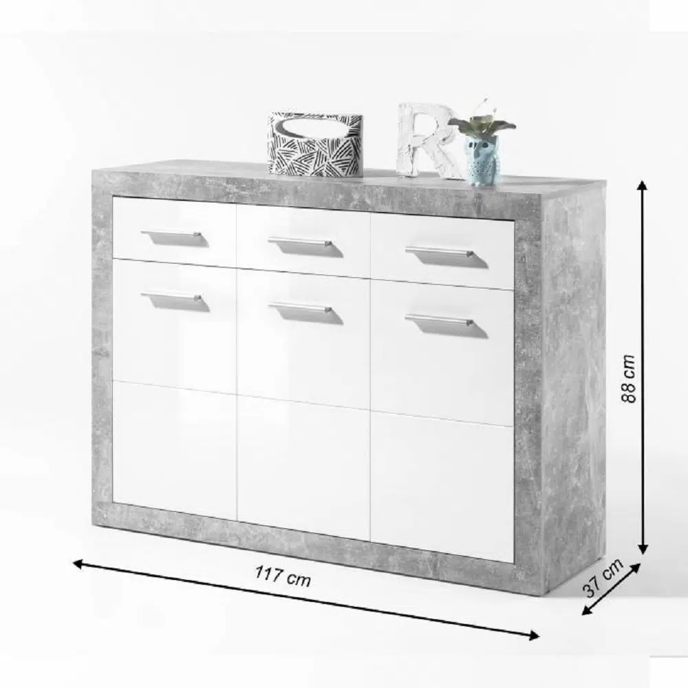 Cadrul larg adaugă un efect mai masiv scrinului, material DTD laminat, culoare: gri+alb lucios. Scrin cu trei uşi şi trei sertare. Dimensiuni: LxÎxG 117x88x37 cm.