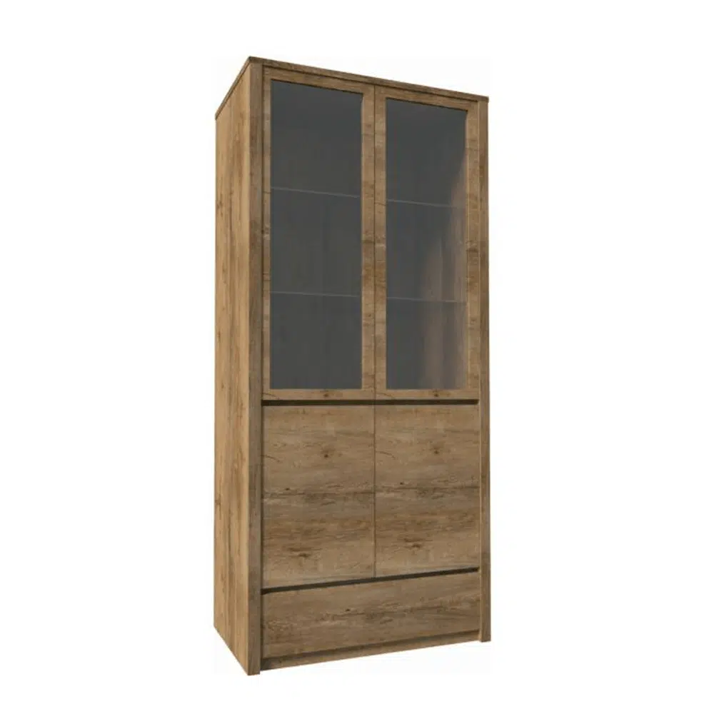 Vitrină cu un sertar şi uşi împărţite pline şi cu sticlă, stejar lefkas închis, MONTANA W2D